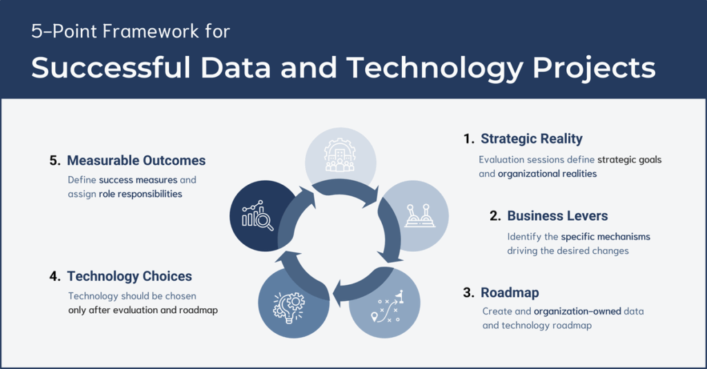 Data strategy, current-state / future-state roadmap design, and change management to ensure data and technology initiatives deliver measurable impact and adoption.